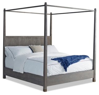 Here, a textured, sandblasted teak headboard meets superb leather side and foot.
